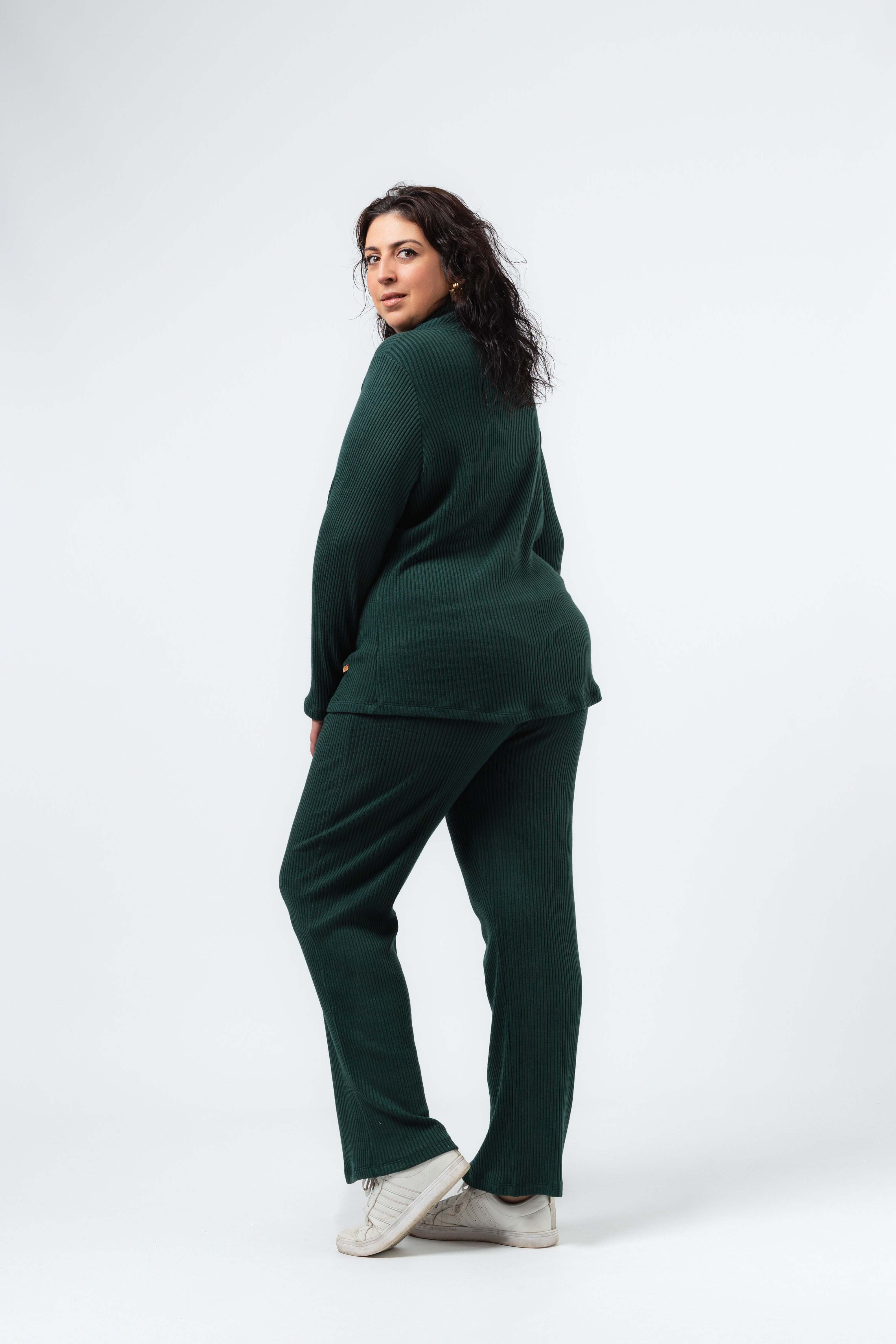 Conjunto em malha lisa canelada, camisola gola alta caída, base arredondada, calça com elástico recoberto na cintura. Disponível em Tamanhos Grandes Produto de desenho e fabrico próprio. Somos uma marca de confeção de vestuário com mais de 50 anos de experiência Modelo: Altura 1.82m e está a vestir o tamanho 3XL.