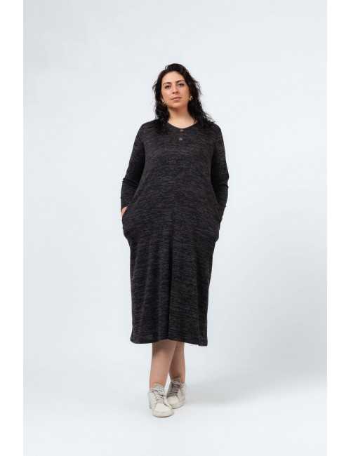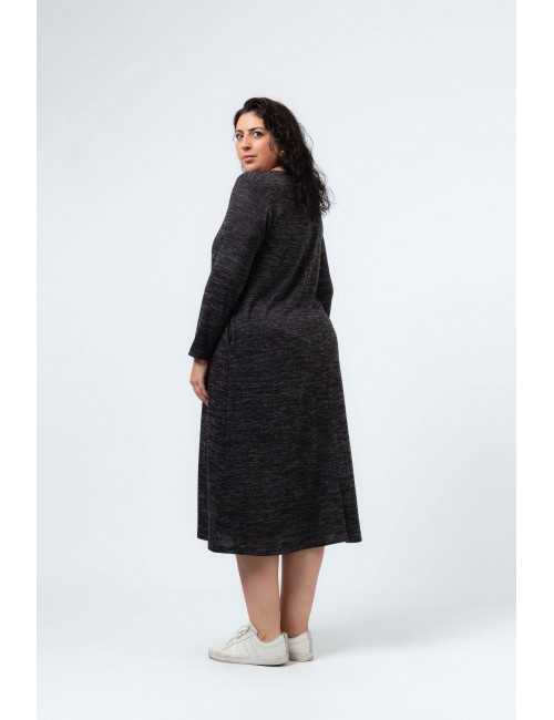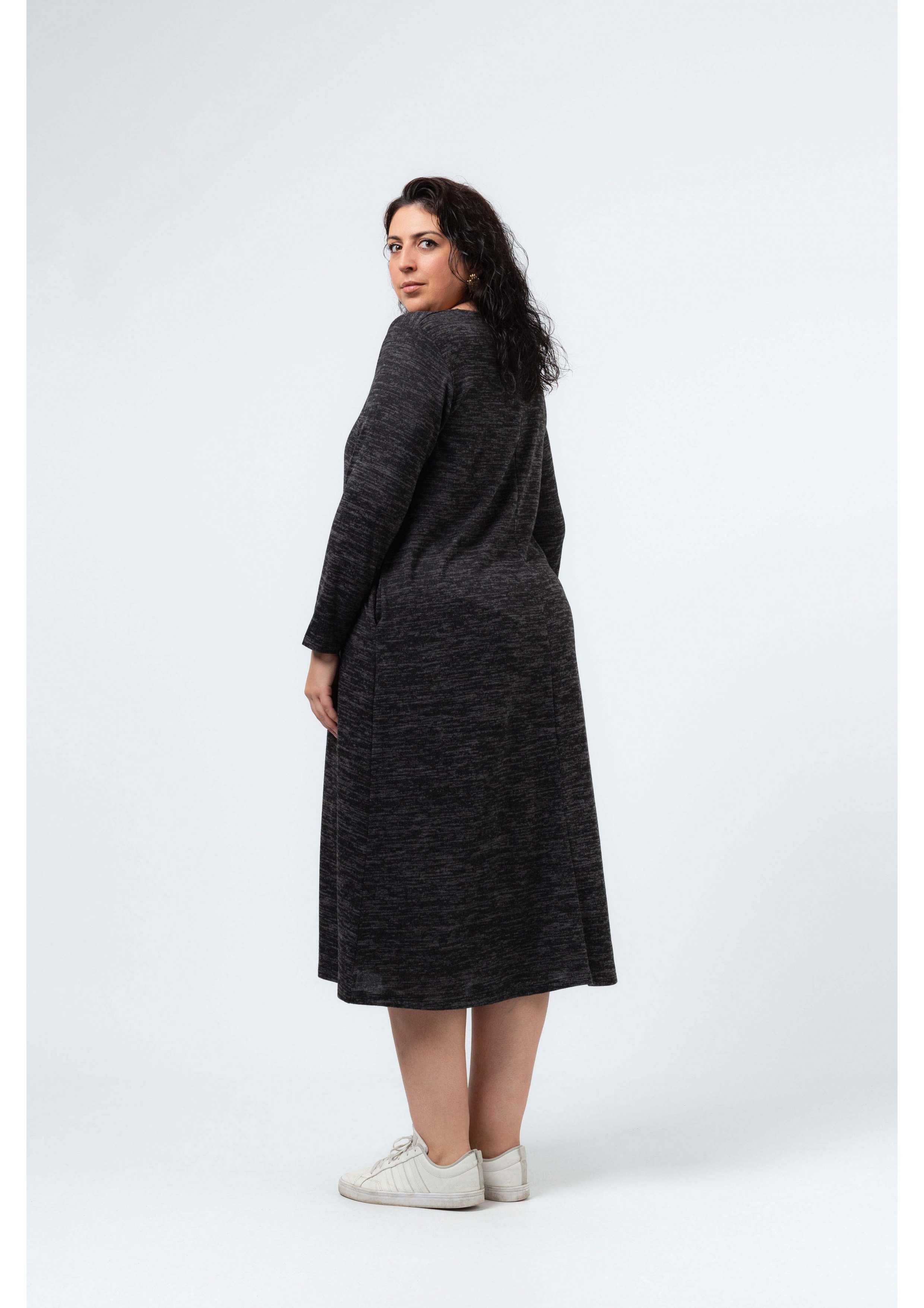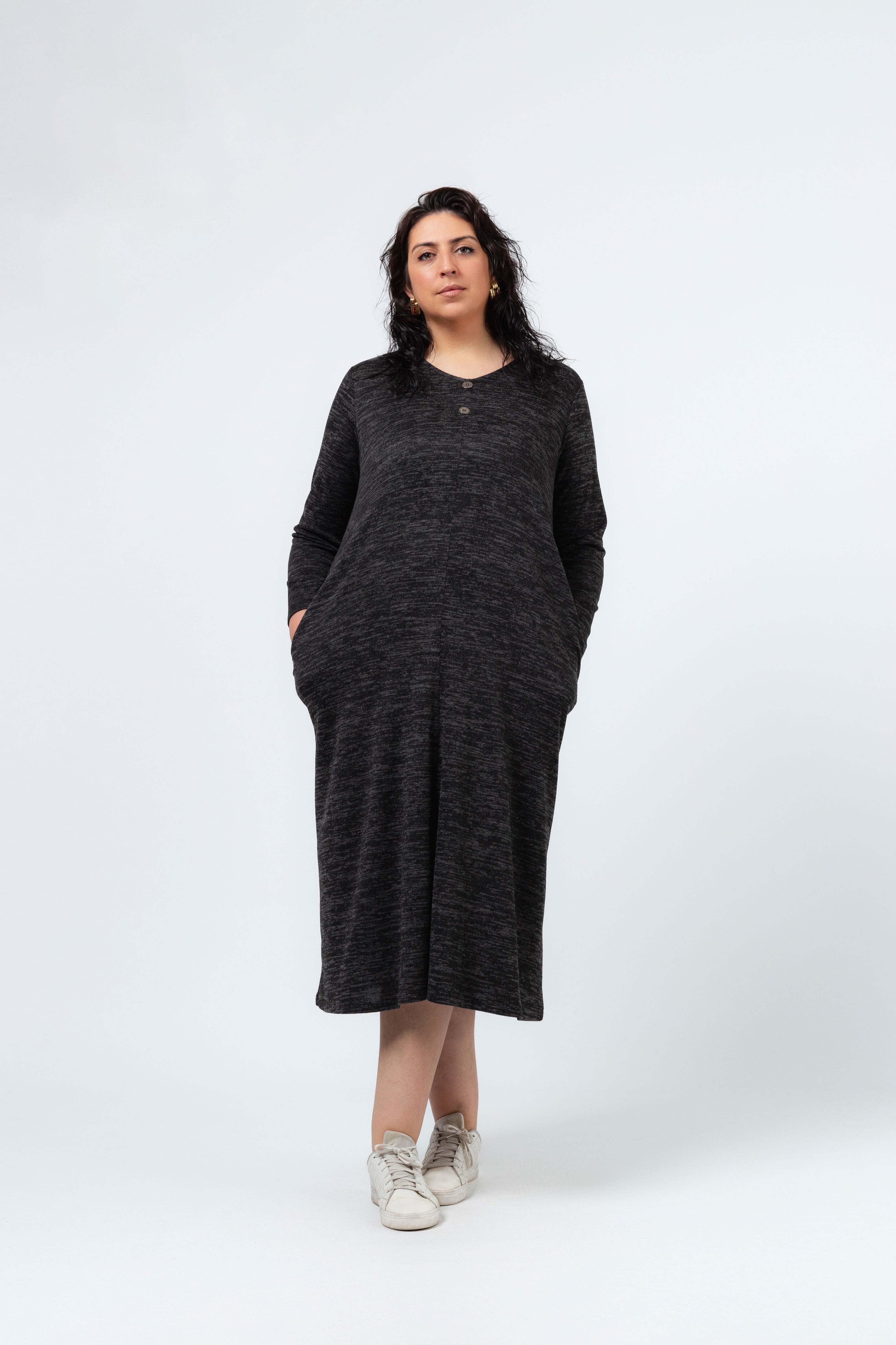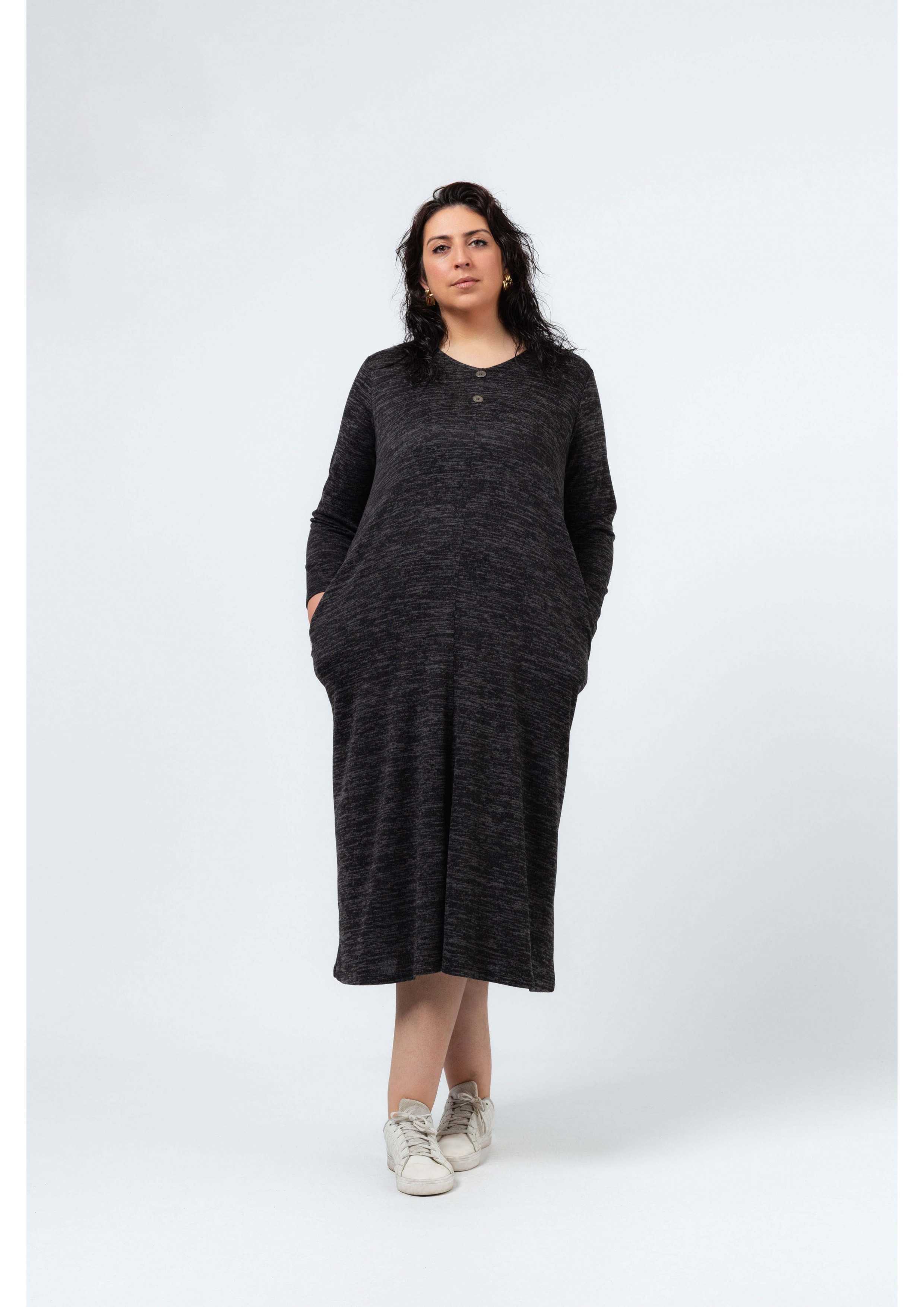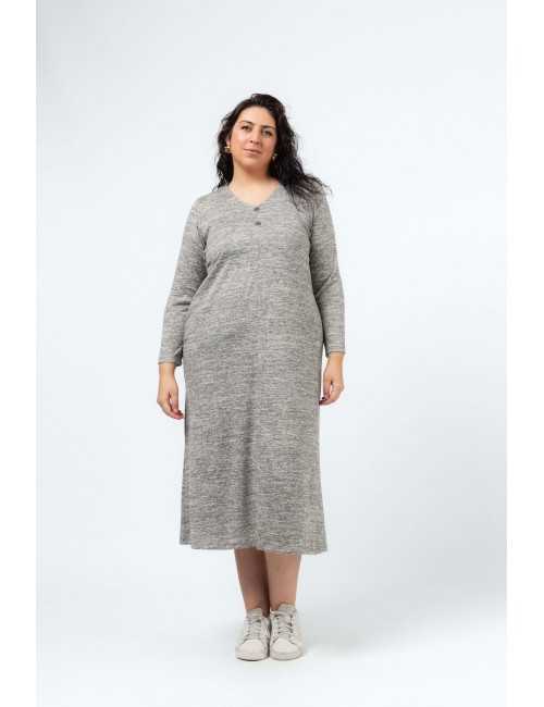 Vestido em malha mescla, compriido, corte na frente e costa. Decote em bico. Manga comprida. Leva dois botões a feitio na frente. Disponível em Tamanhos Grandes Produto de desenho e fabrico próprio. Somos uma marca de confeção de vestuário com mais de 50 anos de experiência Modelo: Altura 1.82m e está a vestir o tamanho 3XL.