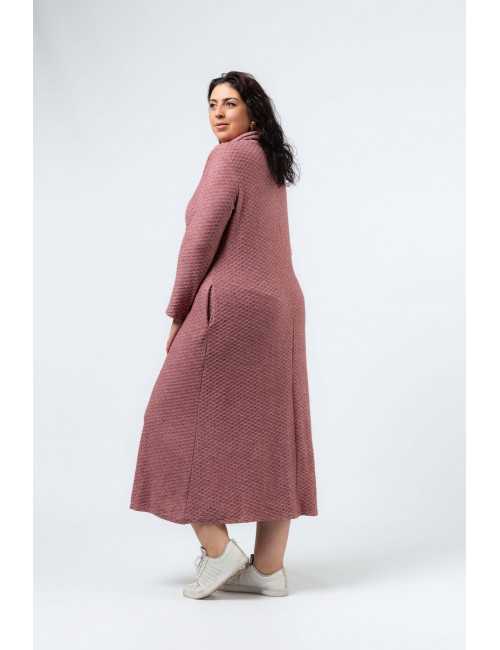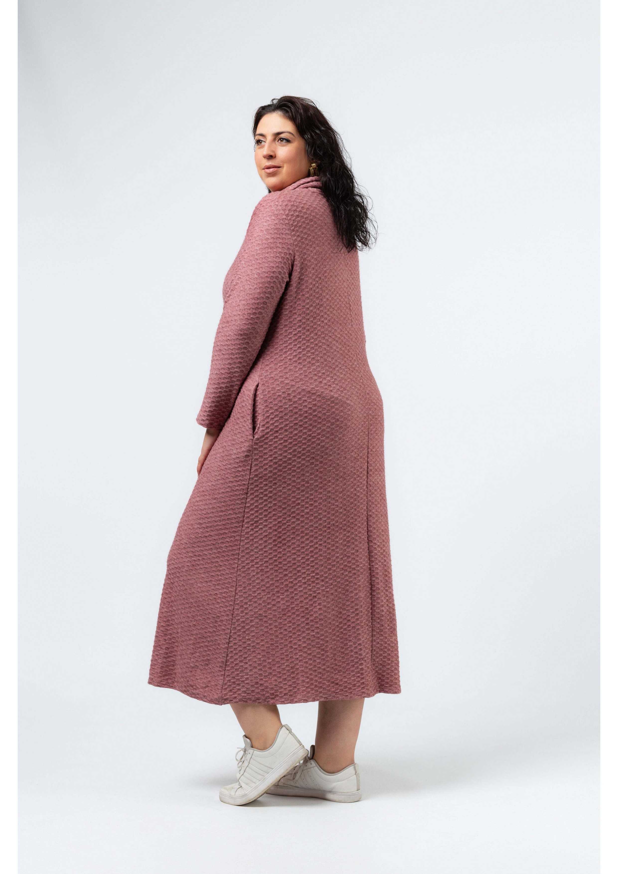 Vestido em malha lisa, com relevo. corte na costa. Gola alta aplicada e caída. Bolsos laterais. Modelo ligeiramente evasé.