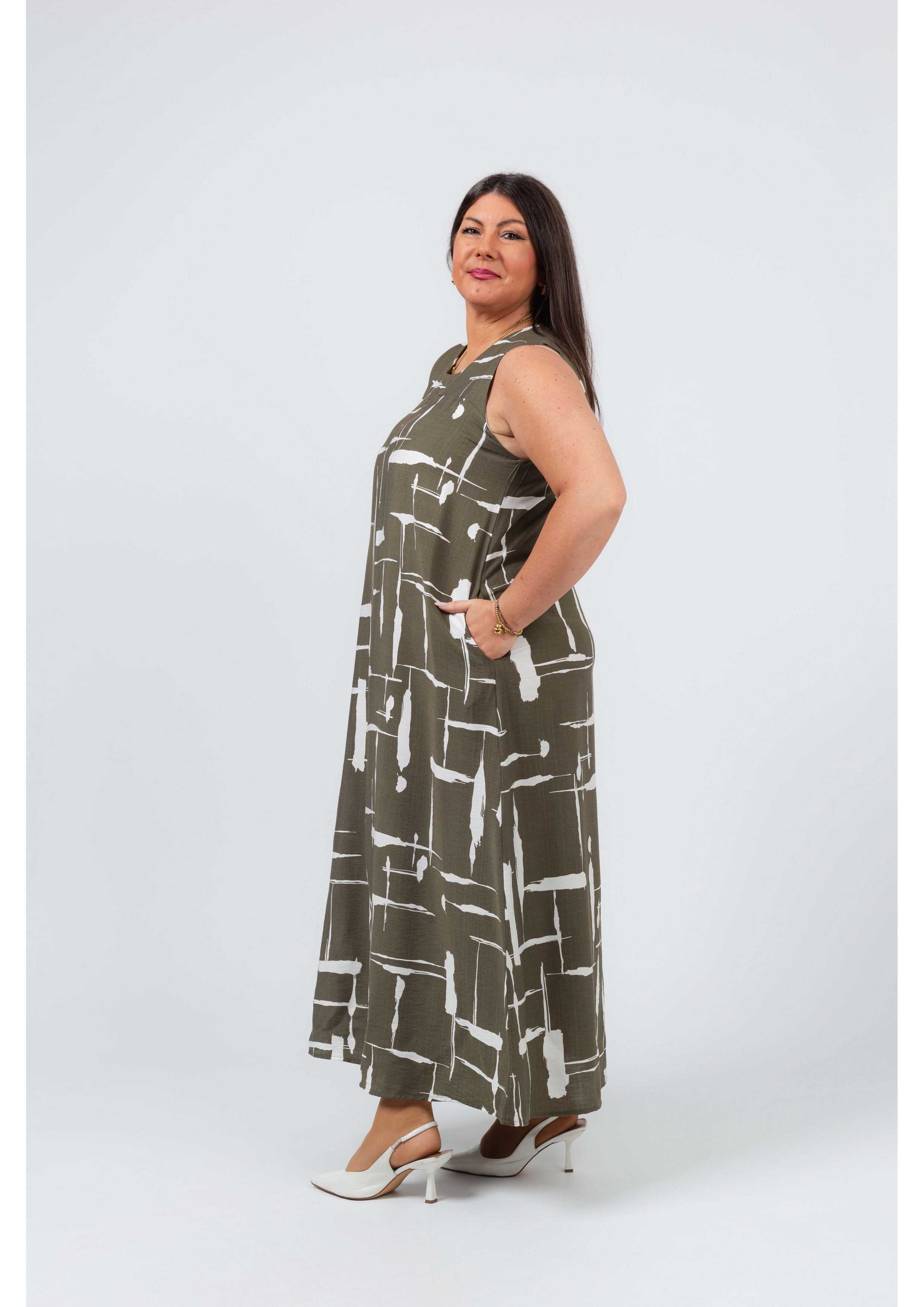 Vestido em tecido estampado, comprido e caveado, bolsos laterais. Corte na costa e na frente, encaixe no peito. lágrima costa com botão. Disponível em Tamanhos Grandes Produto de desenho e fabrico próprio. Somos uma marca de confeção de vestuário com mais de 50 anos de experiência