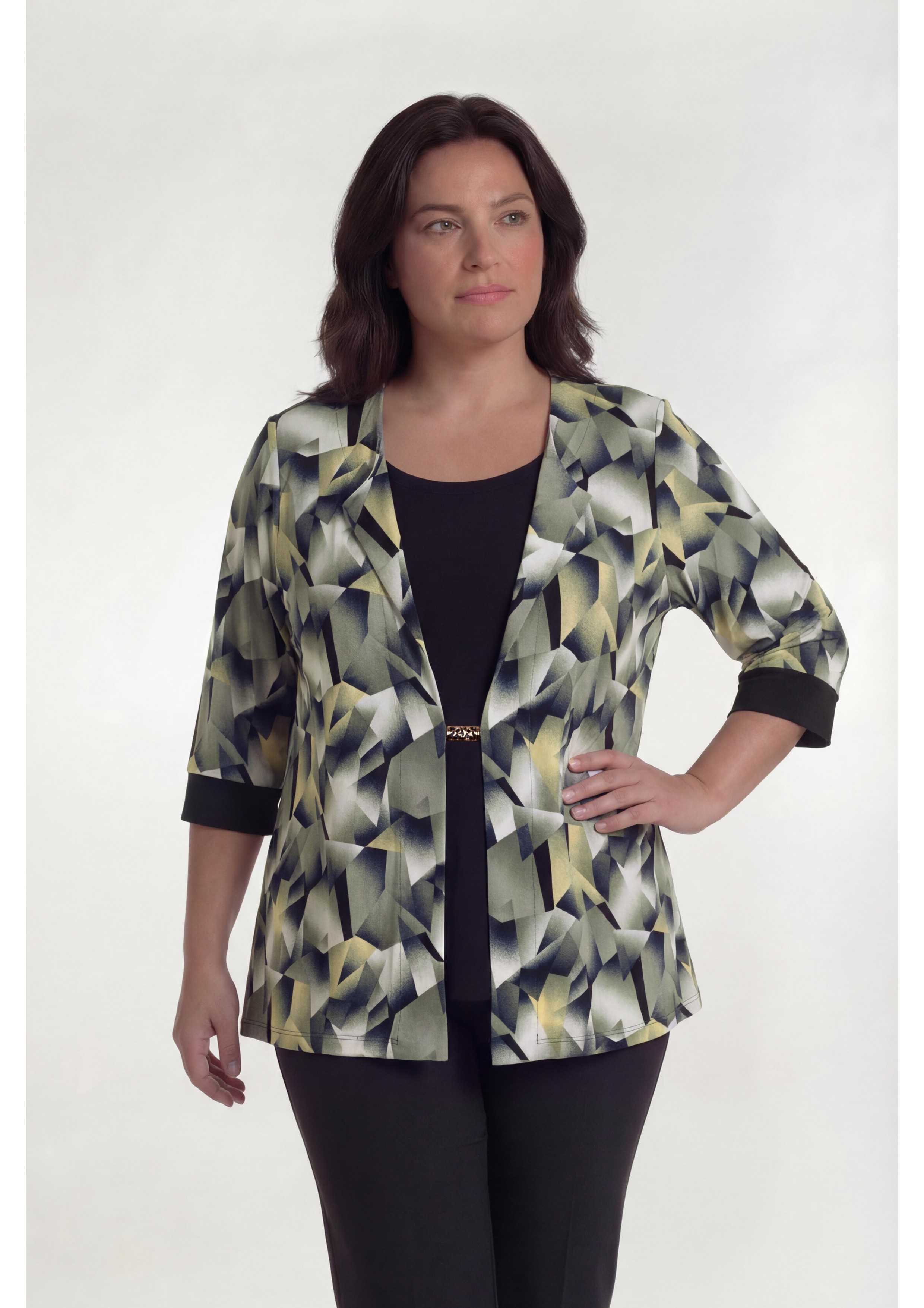 Conjunto em malha estampada e lisa, 2 em 1, em tons marinho. Camisola lisa, apenas frente pregada no casaco, Casaco estampadao manga 3/4 com punho liso. Leva uma aplicação a unir a frente do casaco. Disponível em Tamanhos Grandes Produto de desenho e fabrico próprio. Somos uma marca de confeção de vestuário com mais de 50 anos de experiência Composição: |