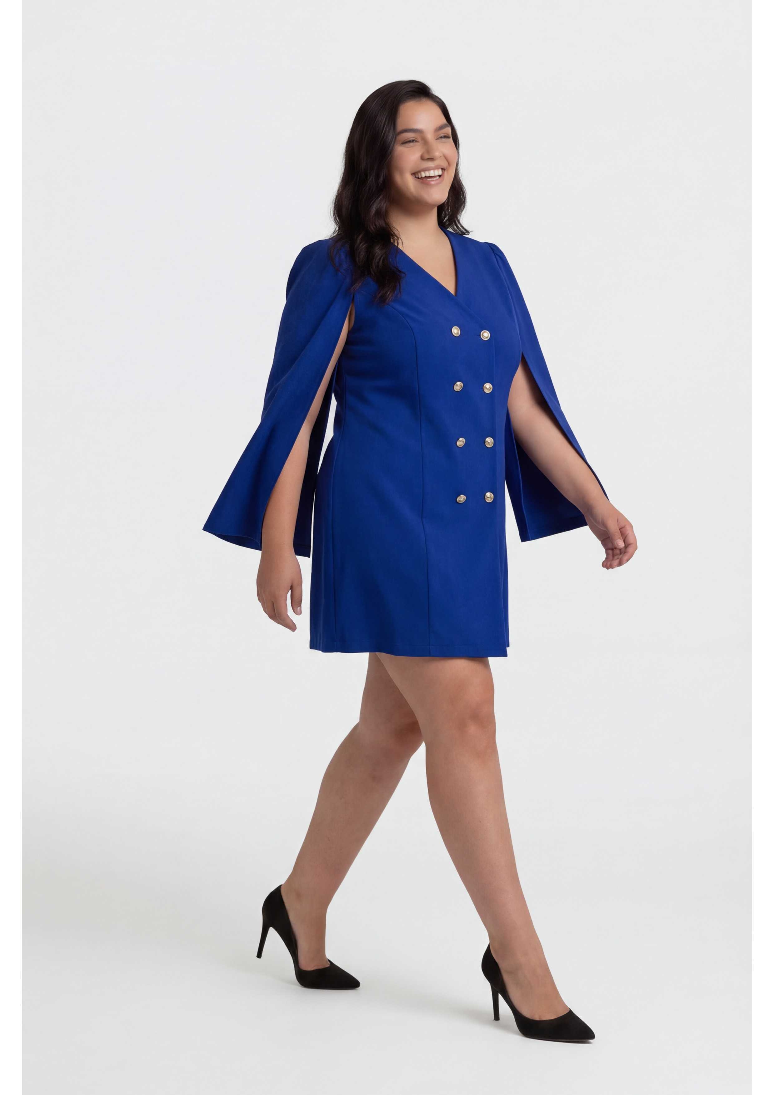 Vestido em tecido liso, estilo casaco de trespasse com botões dourados, caveado com manga estilo capa com franzido no ombro. Leva ombreiras