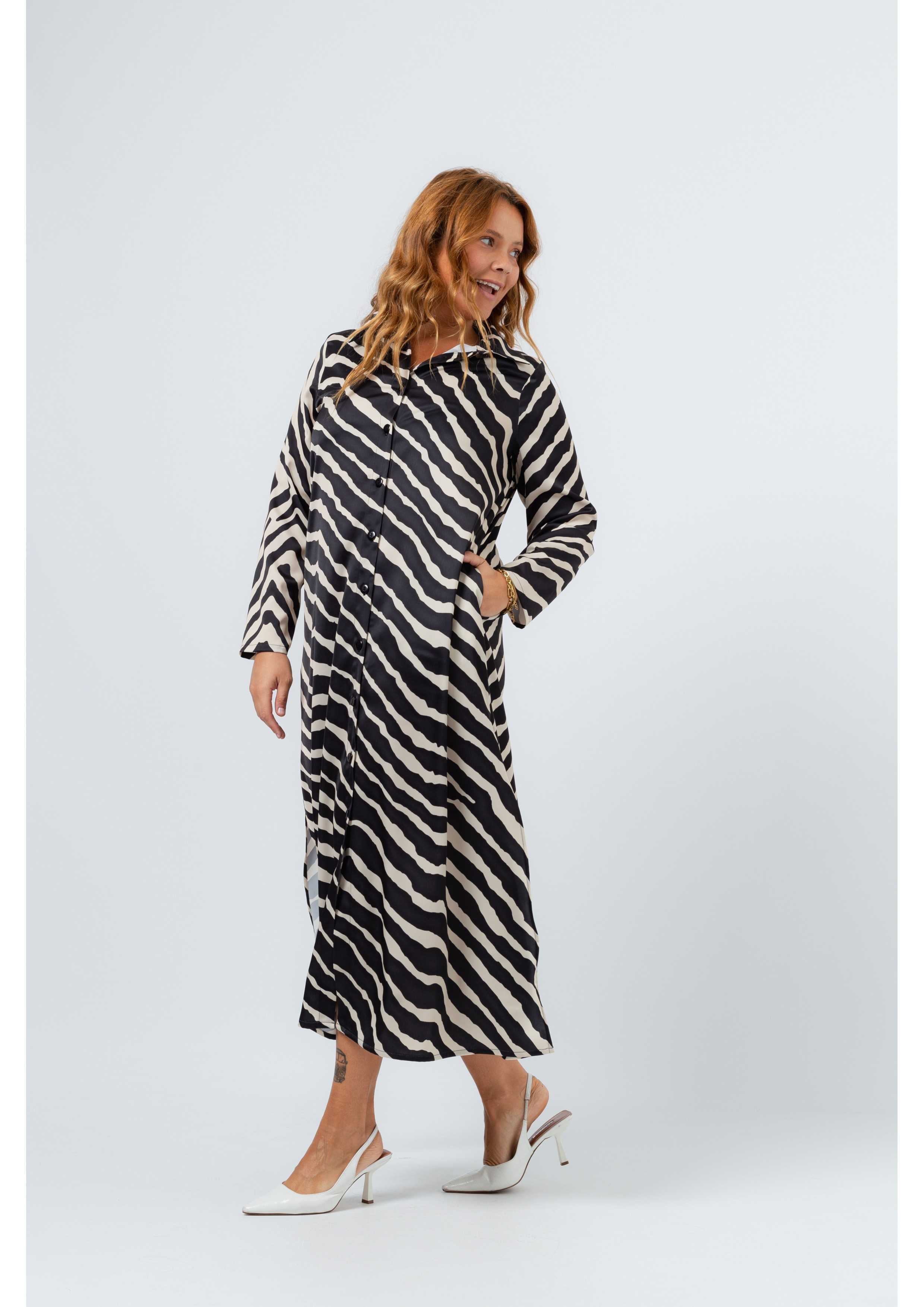 Vestido em tecido estampado, modelo camiseiro, gola e colarinho. Manga comprida. rachas laterais.