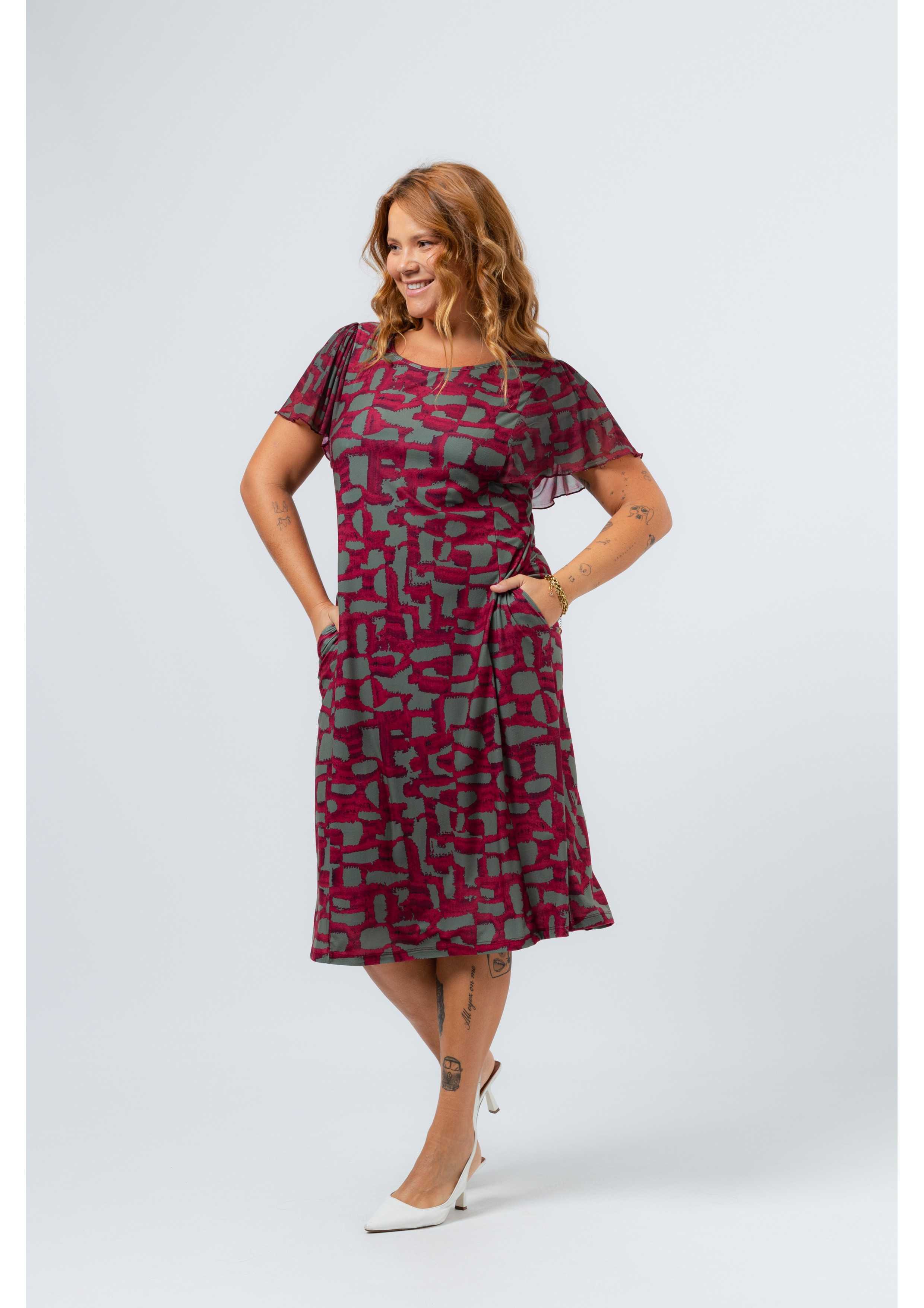 Vestido em malha estampada, com manga sobreposta em malha resil. Bolsos laterais, corte a direito. Disponível em Tamanhos Grandes Produto de desenho e fabrico próprio. Somos uma marca de confeção de vestuário com mais de 50 anos de experiência Modelo: Altura 1.70m e está a vestir o tamanho L.