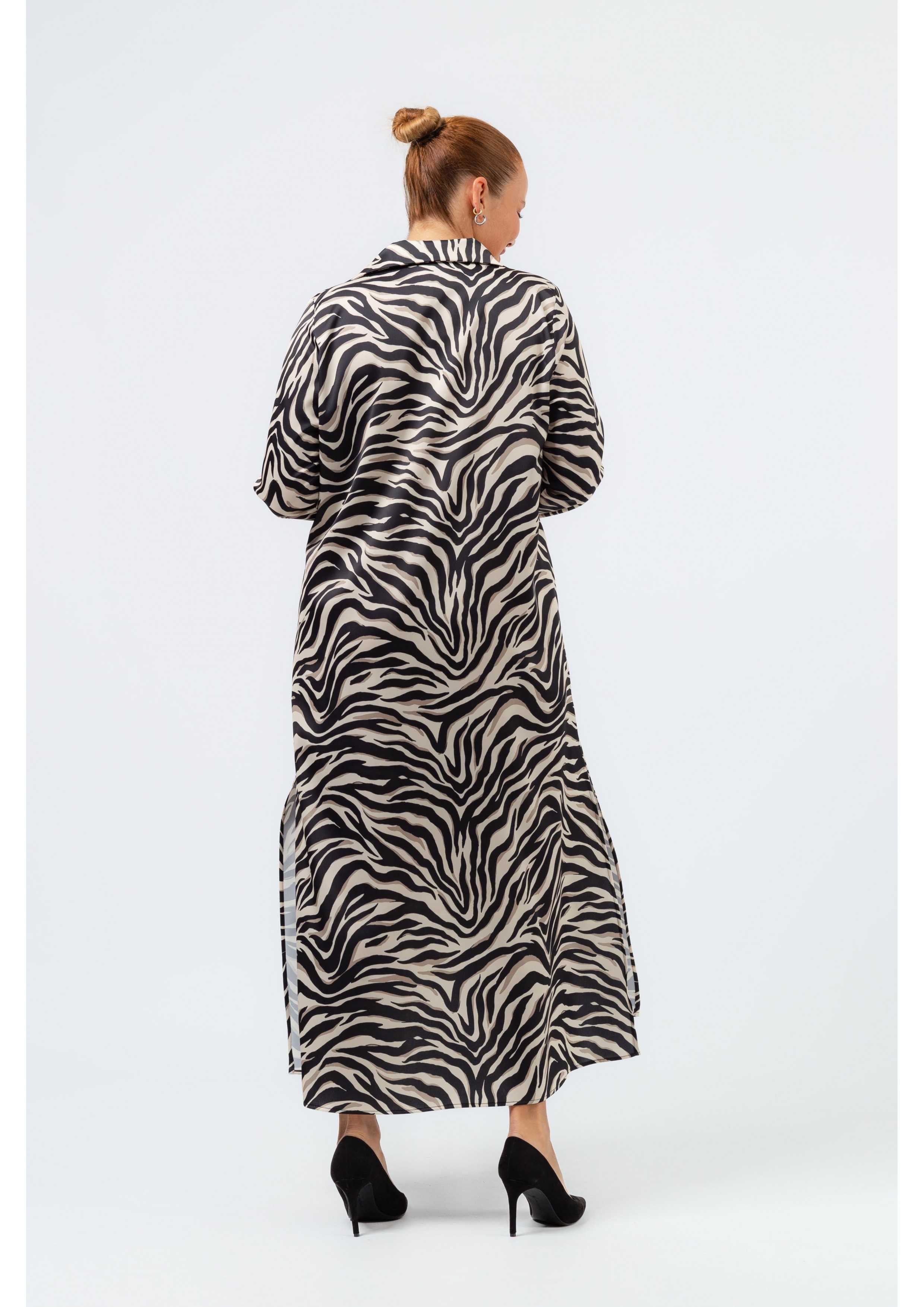 Vestido em tecido estampado, modelo camiseiro, gola e colarinho. Bolsos laterais. Manga comprida. rachas laterais.