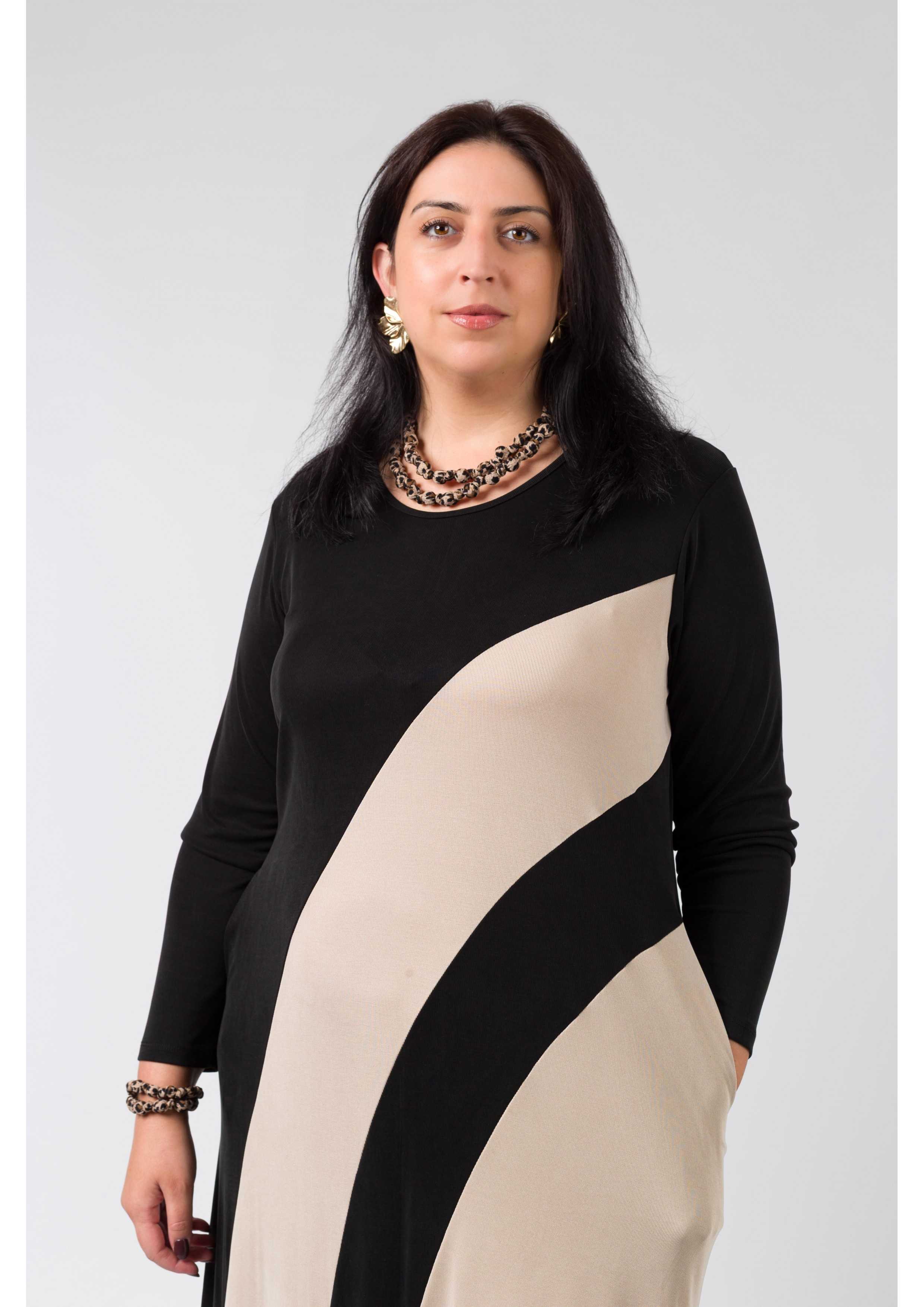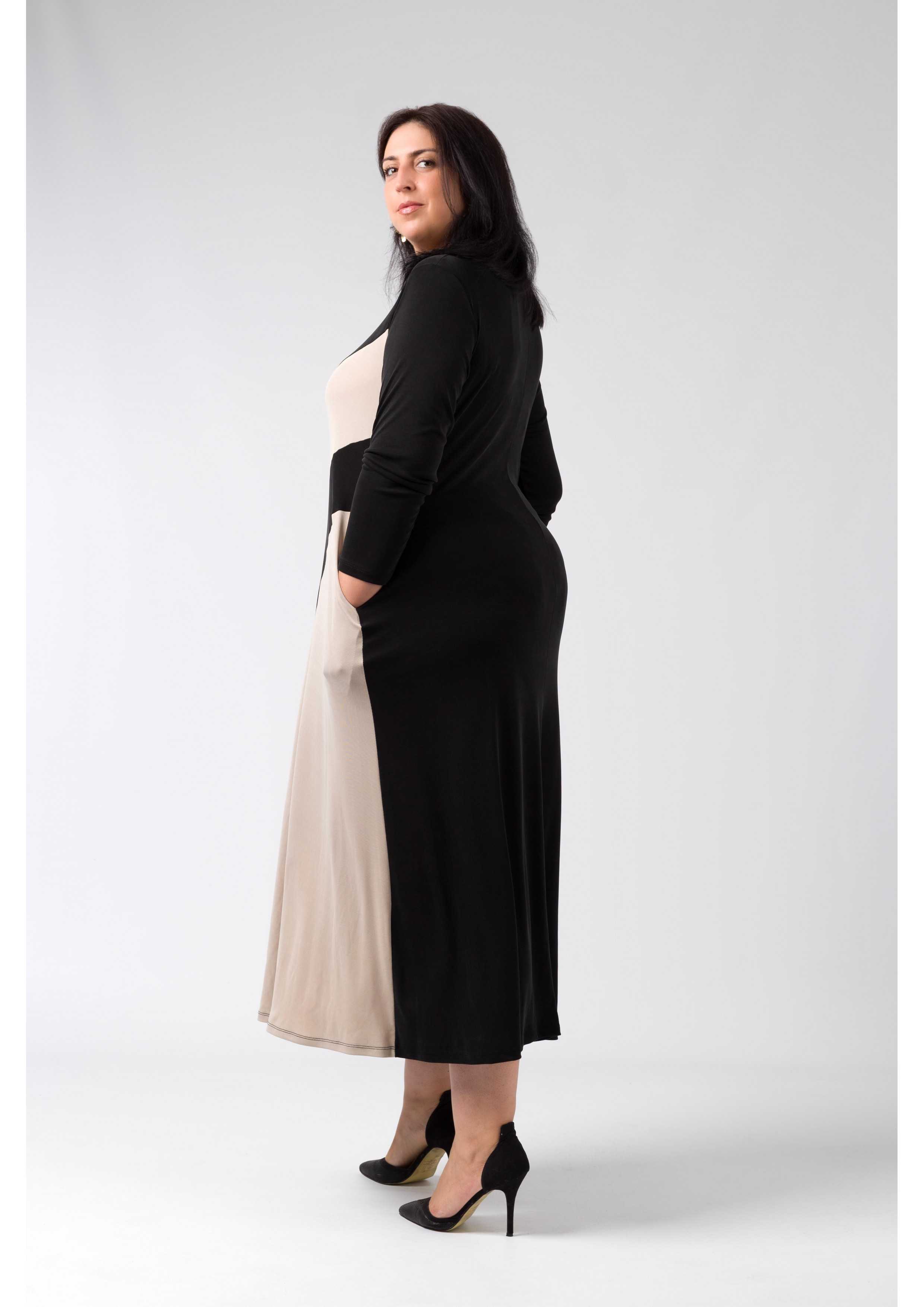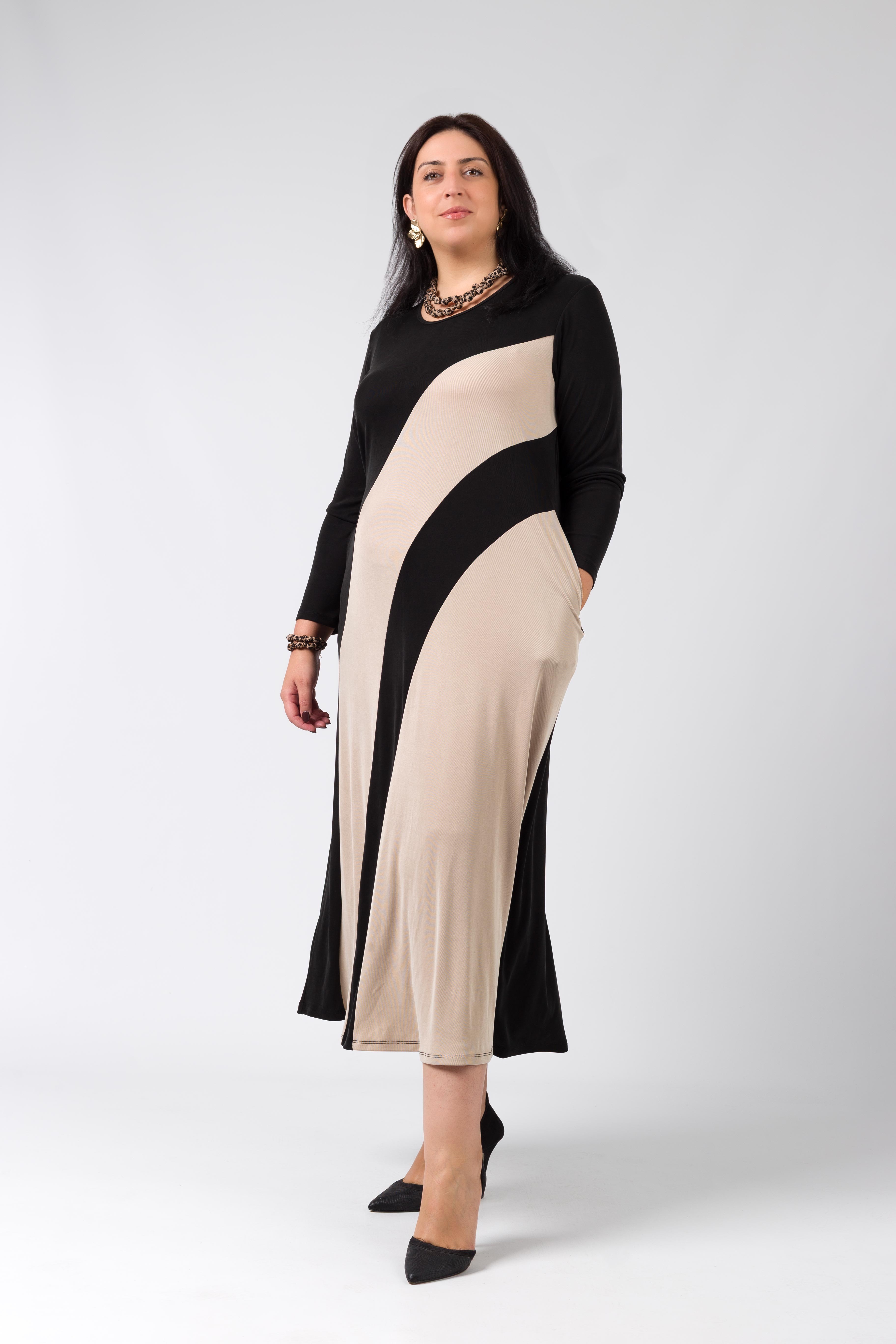 Vestido em malha lisa, modal cana fina. Decote redondo. Manga comprida. Encaixes diagonais em contraste na frente e bolsos laterais.