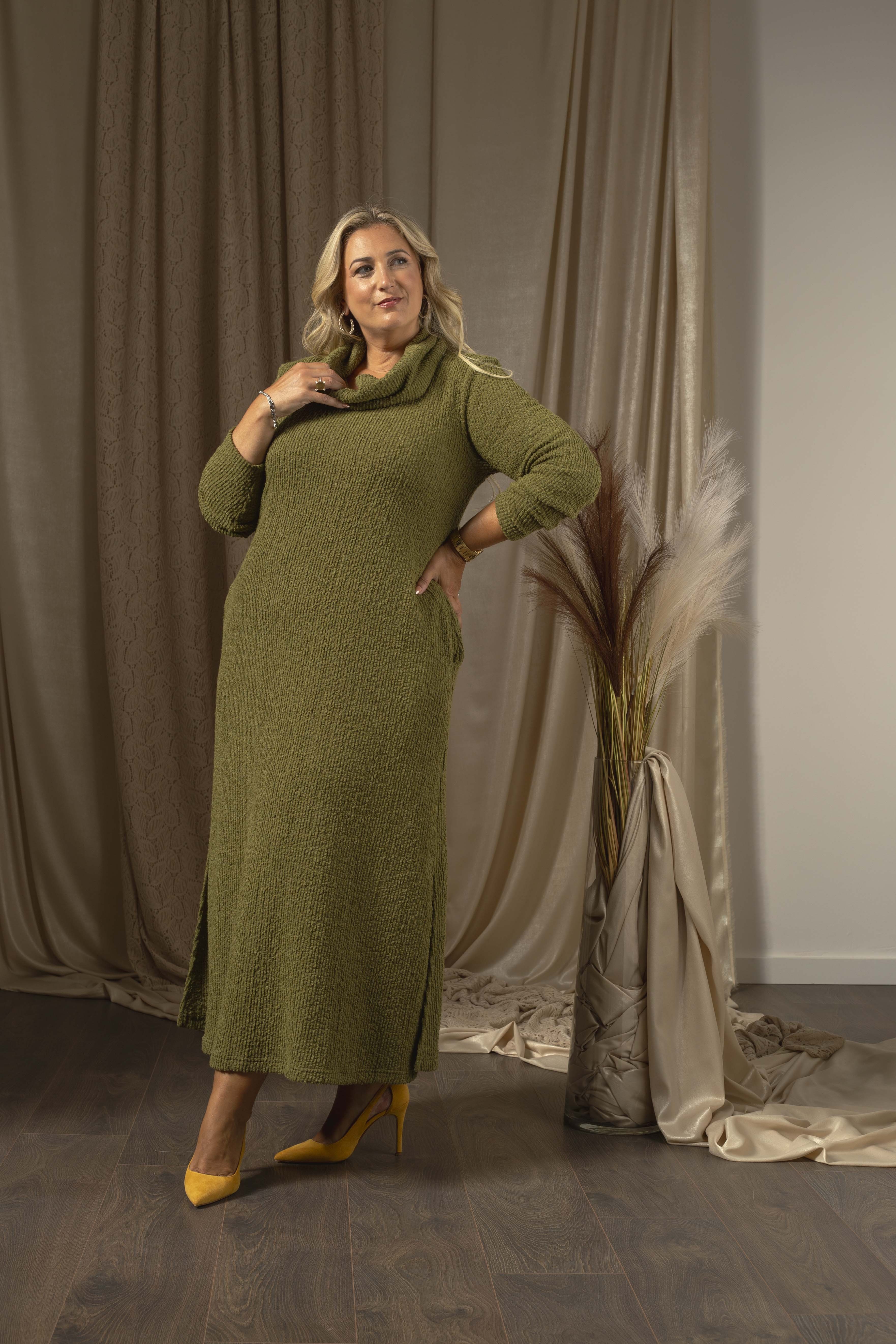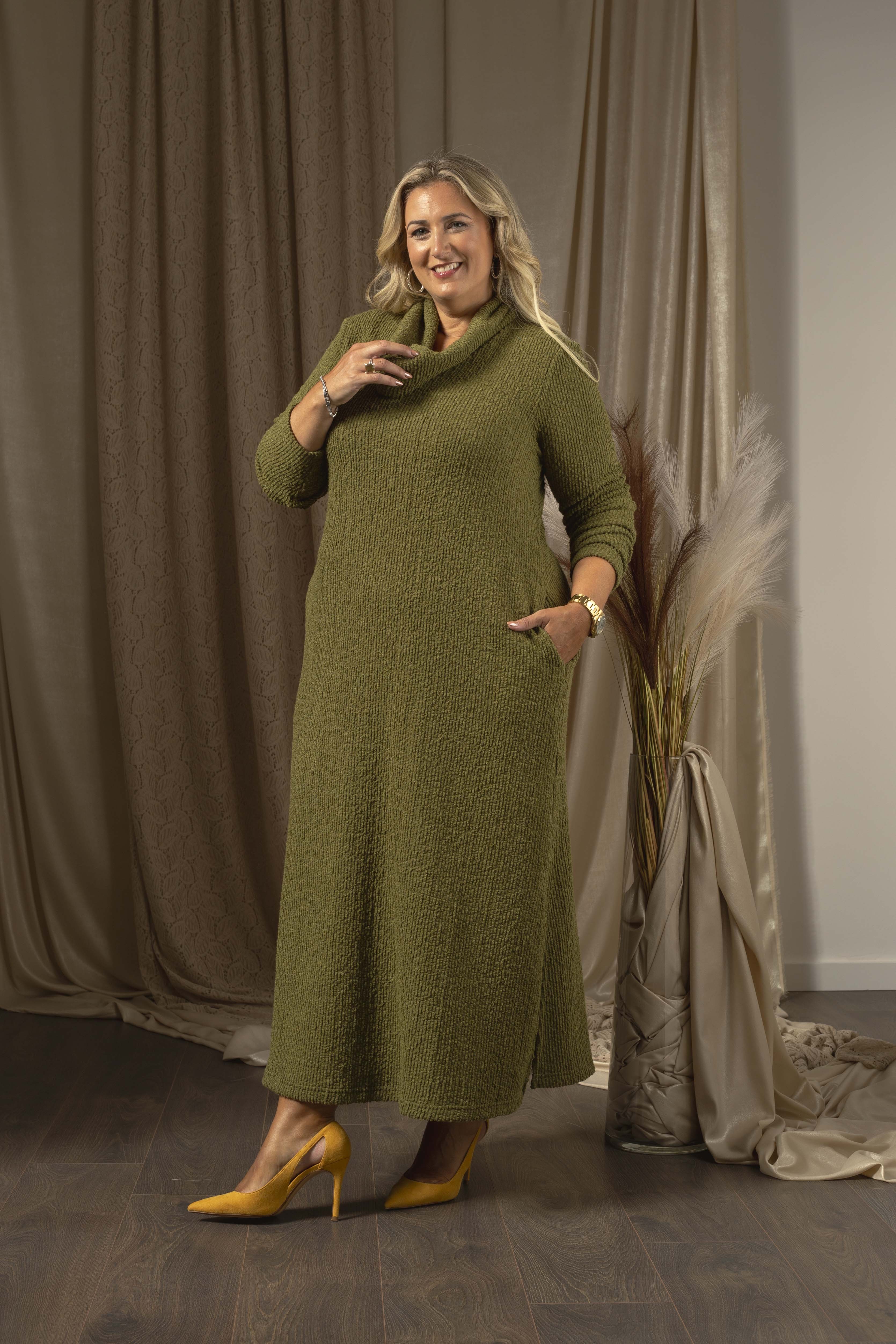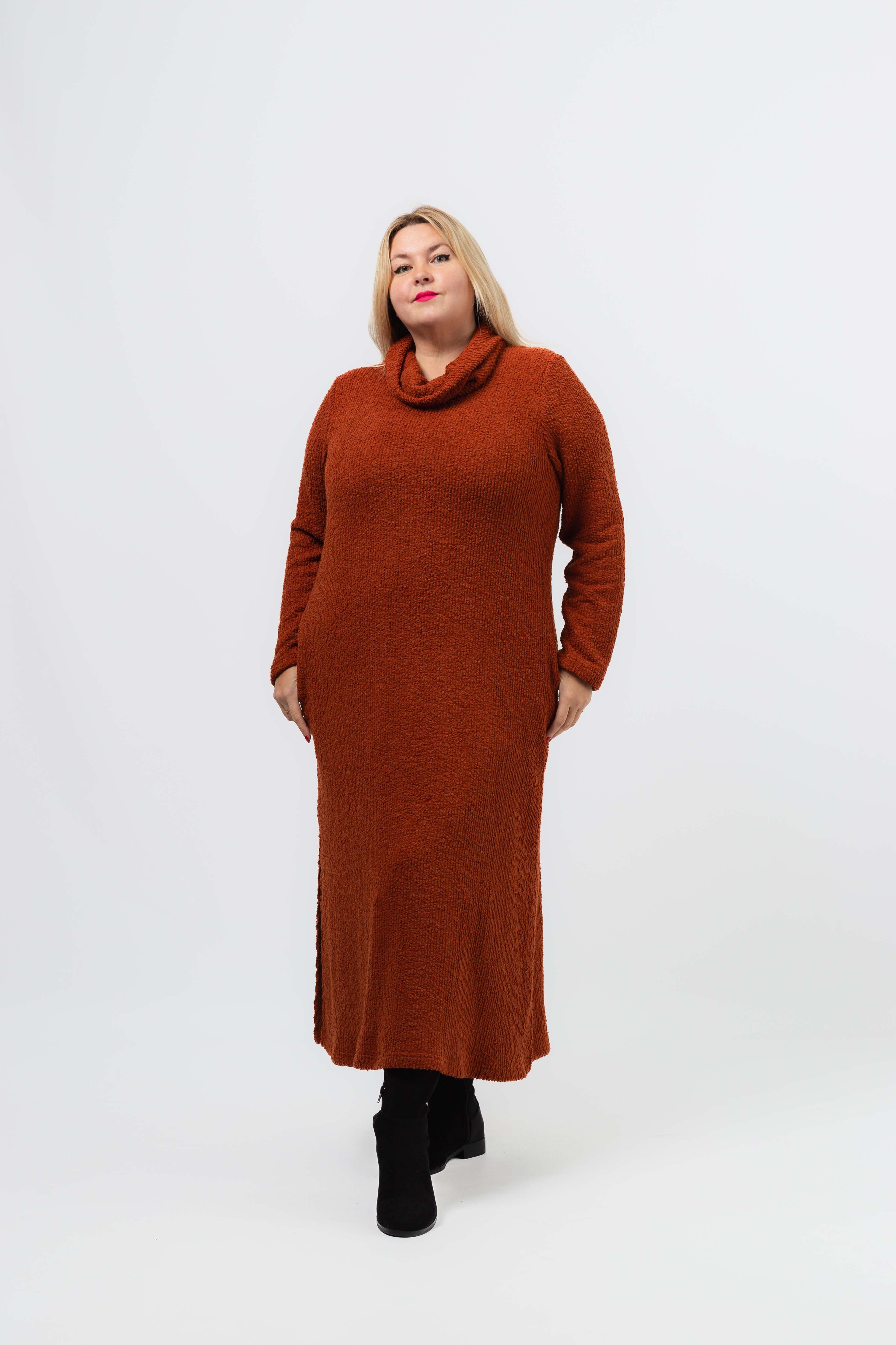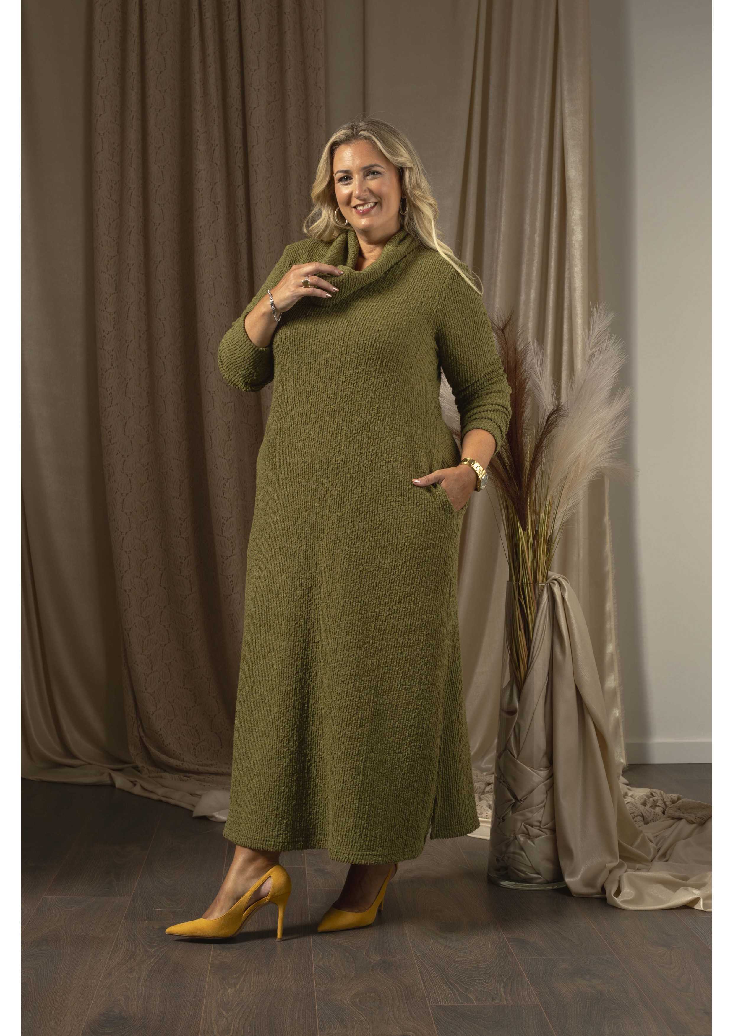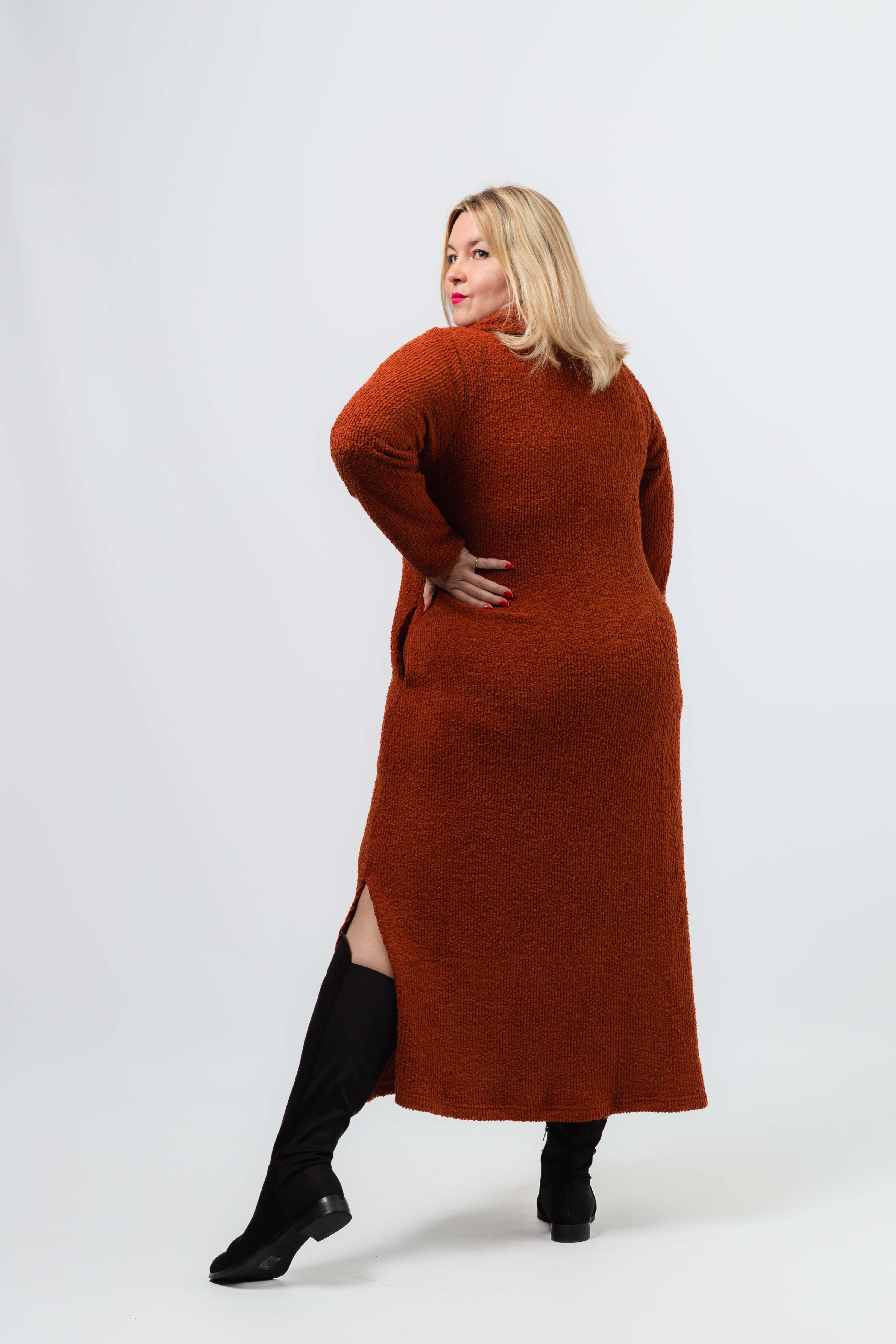 Vestido em malha lisa efeito canelado com relevo, rachas e bolsos laterais. Decote redondo com gola lata larga caída. Disponível em Tamanhos Grandes Produto de desenho e fabrico próprio. Somos uma marca de confeção de vestuário com mais de 50 anos de experiência Modelo: Altura 1.67m e está a vestir o tamanho 3XL.